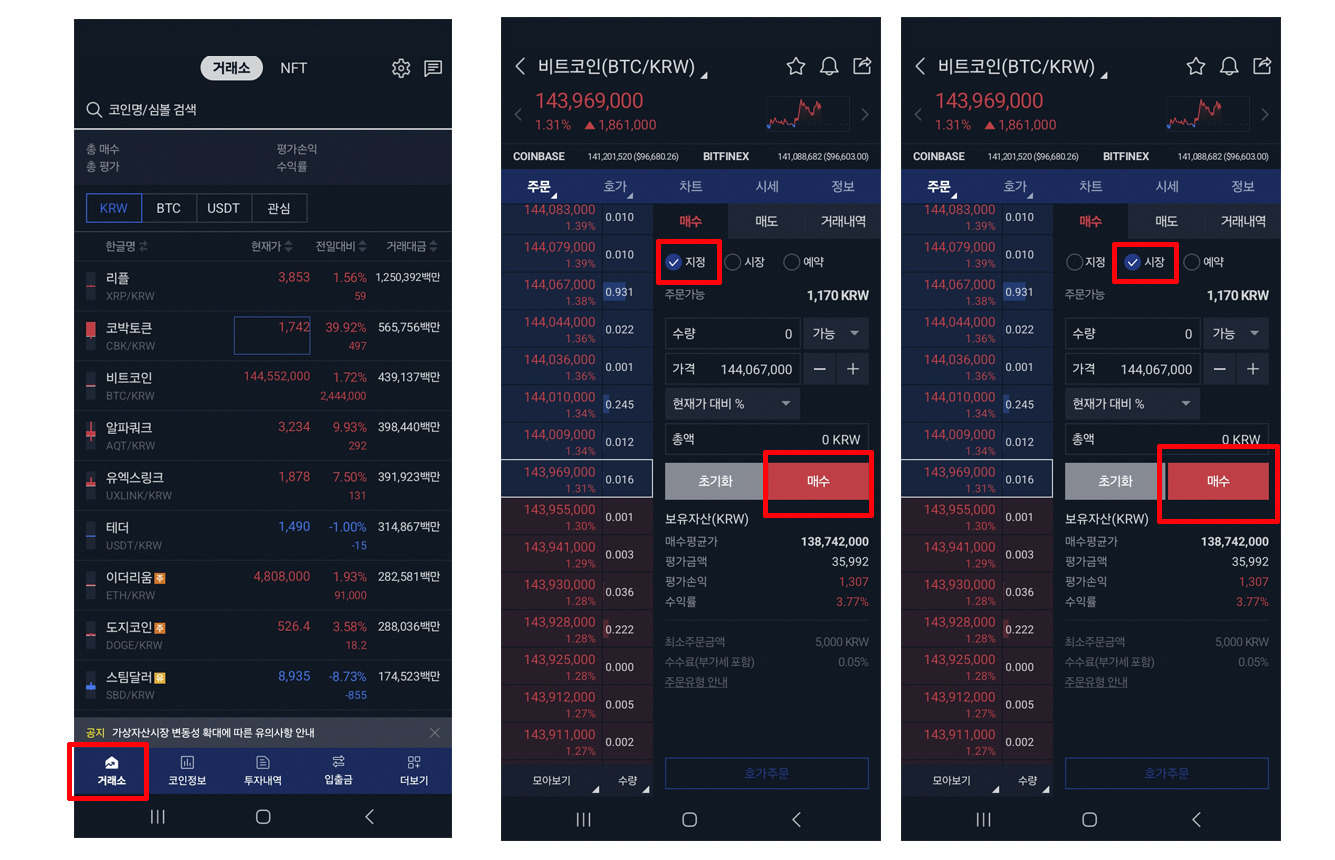 3. 화면이 바뀌고 '매수' 탭을 선택합니다. 지정가 거래와 시장가 거래 중 선택합니다.