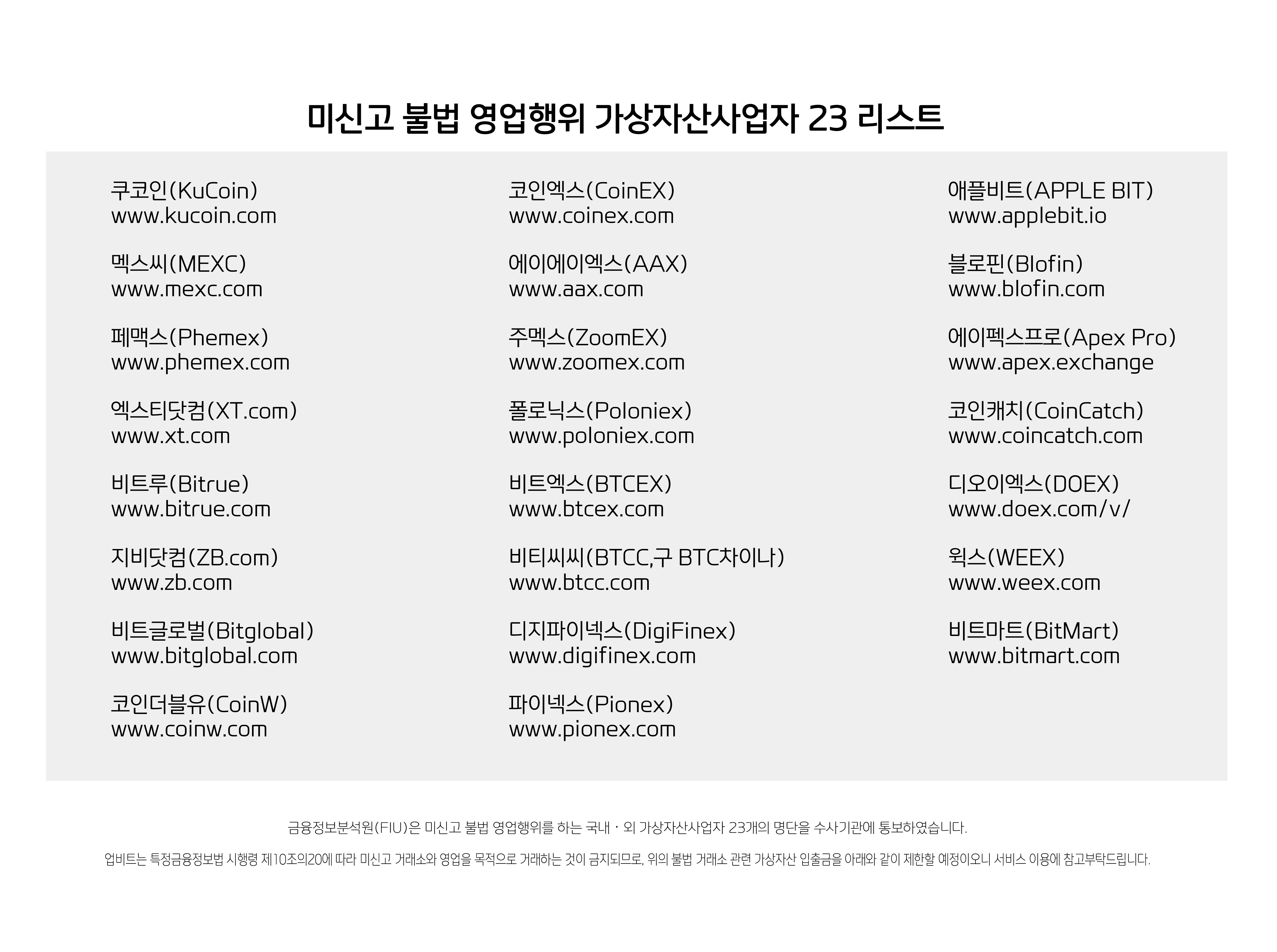 주의할 점은 쿠코인(KuCoin), 멕스씨(MEXC), 페맥스(Phemex), 엑스티닷컴(XT.com), 비트루(Bitrue) 등 23곳의 미신고 거래소는 출금이 제한된다는 것입니다.