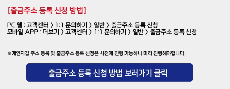 - 사전에 등록된 개인 지갑 주소를 이용하거나 별도의 출금주소 등록 절차를 거쳐야 합니다.