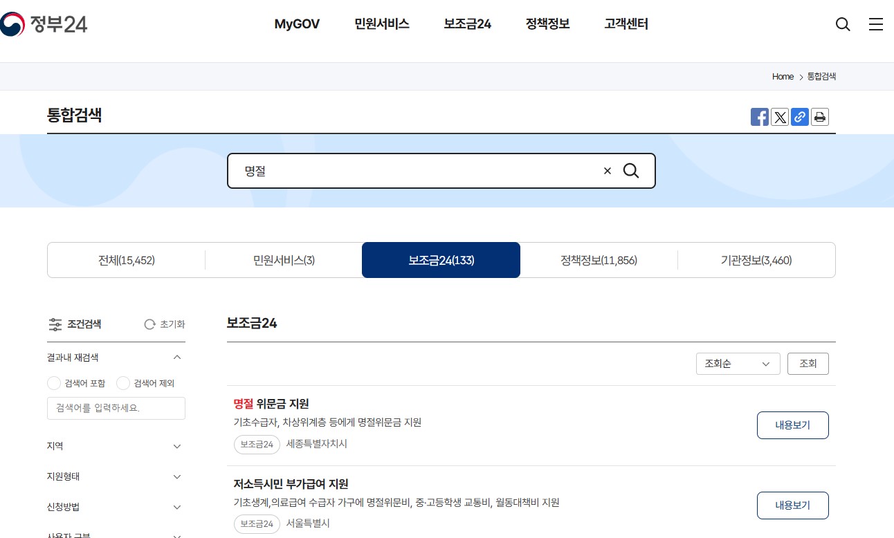 검색창에 "명절"을 입력하면 지역별 혜택과 대상 여부를 확인할 수 있습니다.