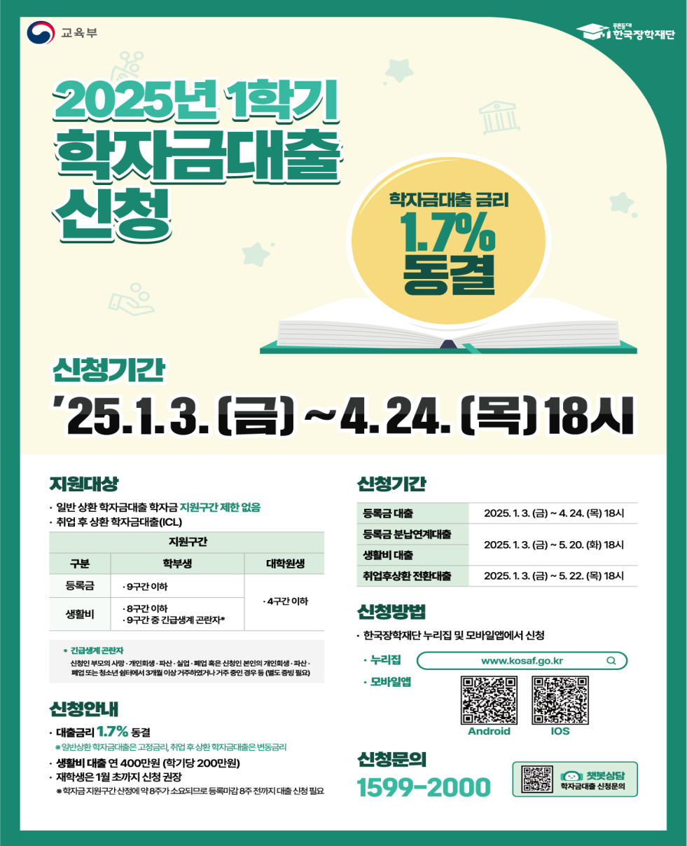 2025년 학자금대출 이자는 2024학년도와 동일하게 1.7%로 유지되며, 이는 높은 물가와 금리 상황에서 학생들의 부담을 덜어주기 위한 조치입니다.